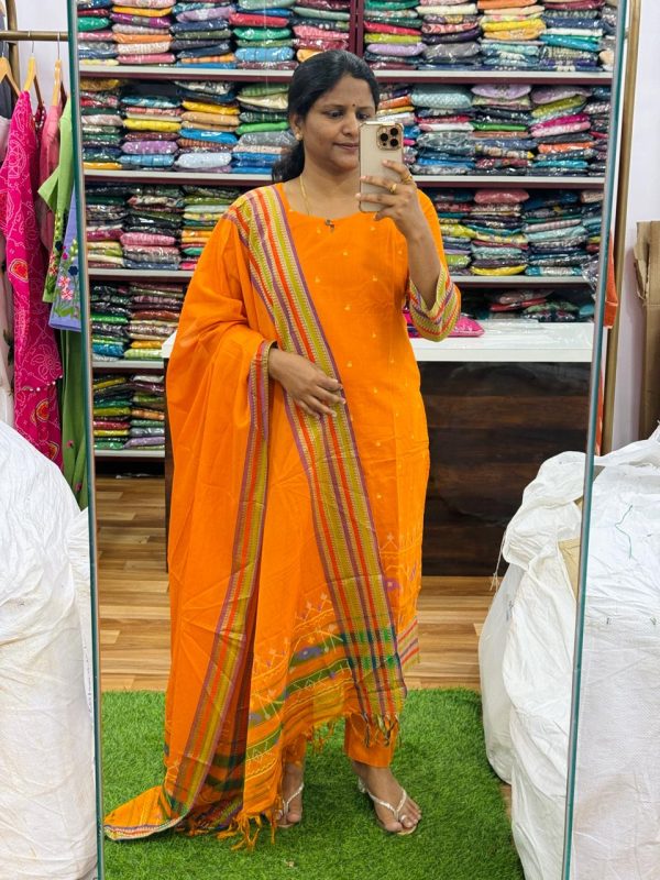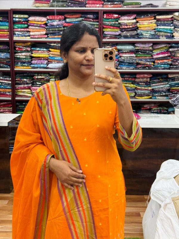 – Beautiful Orange Color Premium Quality Narayanpet Varahi Pattu 3 Piece Kurta Set