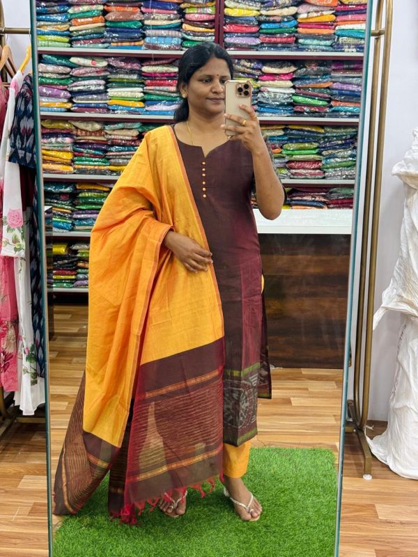 – Beautiful Maroonish Brown Color Premium Quality Ikkat Pattu 3 Piece Kurta Set