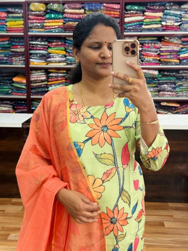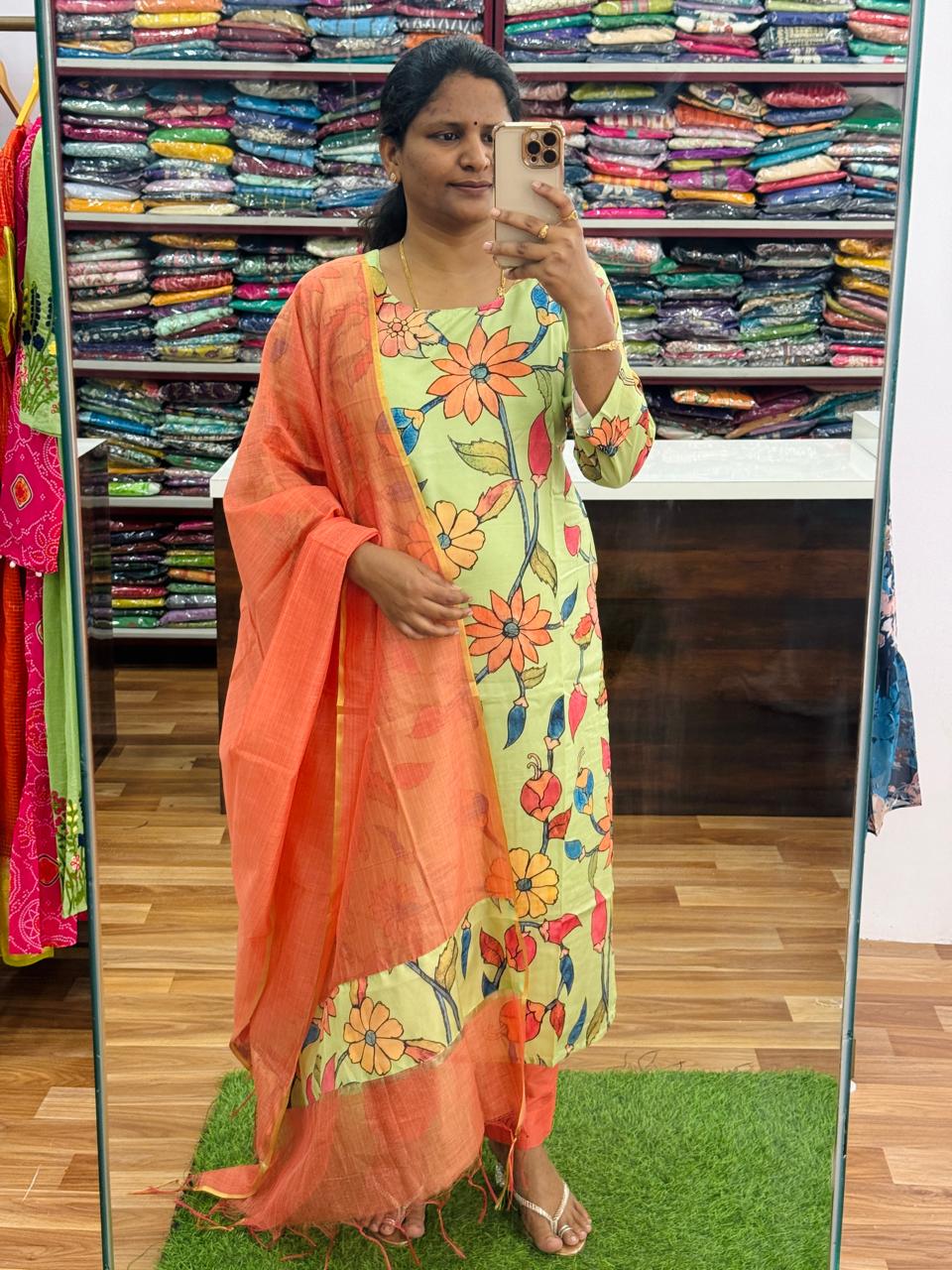 – Beautiful Pista Green Color Kalamkari 3 Piece Kurta Set