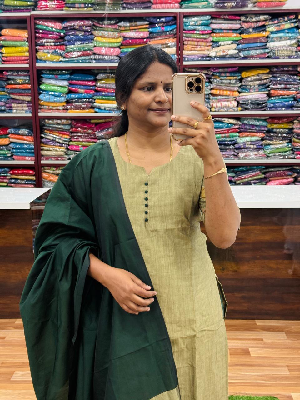 – Beautiful Leight Pista Green Color Premium Quality Ikkat Pattu 3 Piece Kurta Set