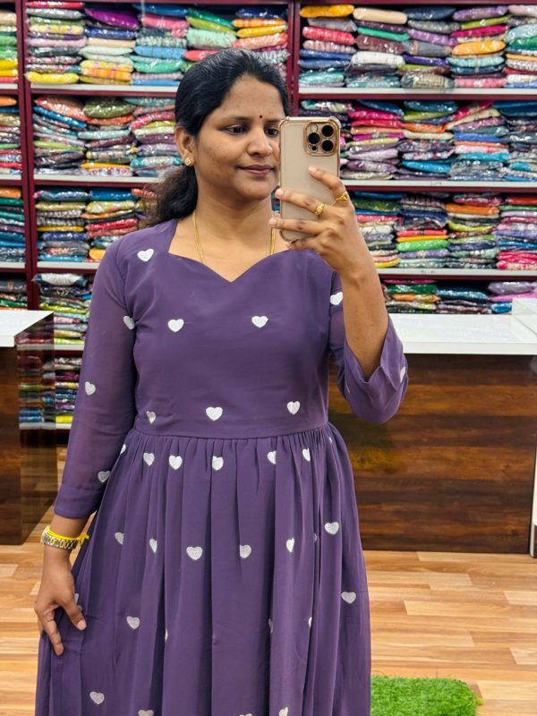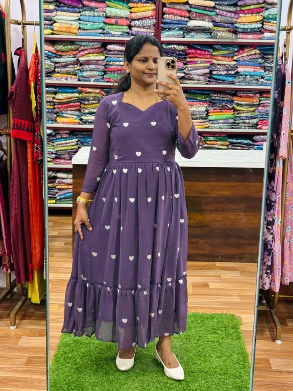 – Beautiful Greyish Wine Color Georgette Hearts Embroidered Ankle Length Gown